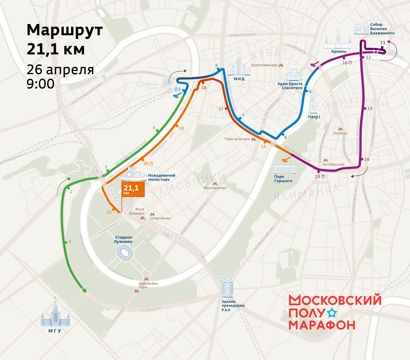 Московский полумарафон — крупнейший забег России на дистанции 21,1 км. В 2026 году участников полумарафонской дистанции ждёт обновлённый линейный маршрут Московского полумарафона. Старт и финиш забега будут находиться в разных местах. Полумарафонская дистанция начинается от Университетской площади и завершится на улице Лужники.